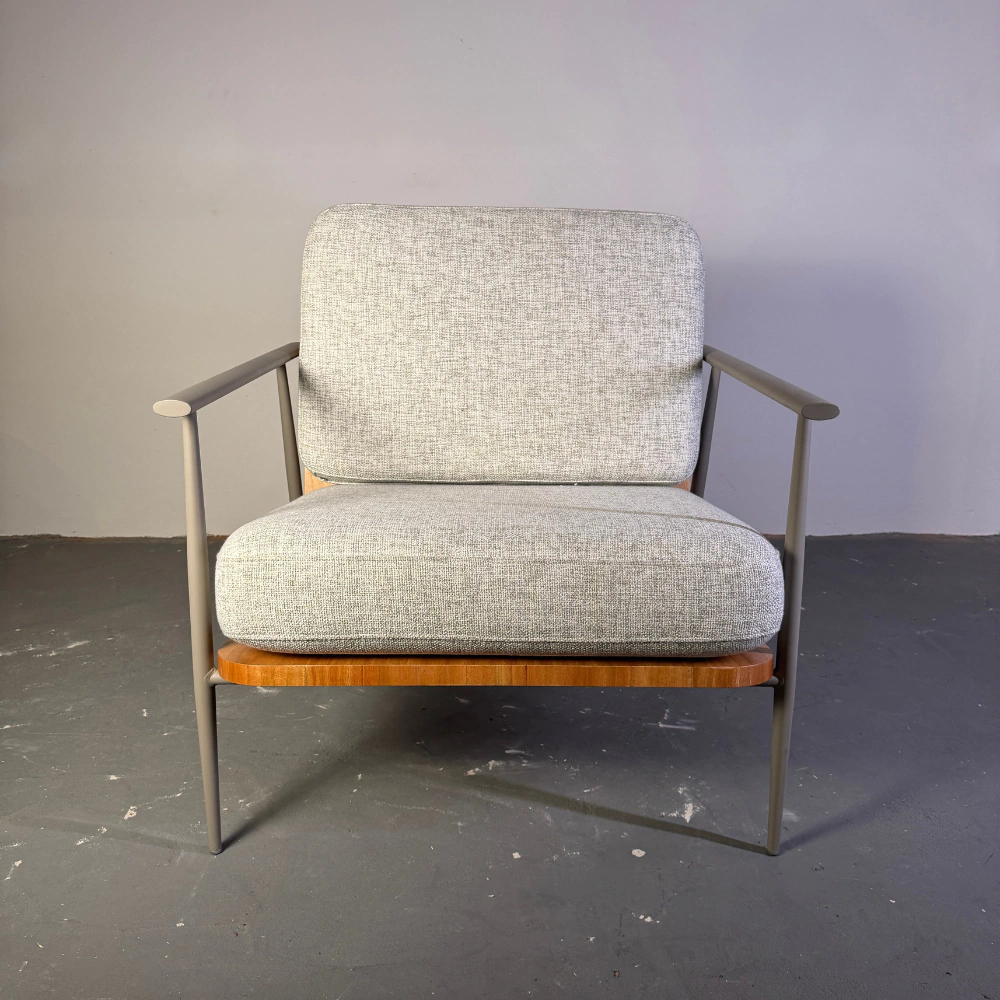 A Poltrona Savage traduz elegância contemporânea com linhas retas e proporções equilibradas. Sua estrutura em metal na cor dune confere leveza visual e resistência, enquanto o assento e o encosto estofados garantem conforto no uso diário. O detalhe em lâmina natural de madeira adiciona sofisticação e calor ao design, criando um contraste elegante com o revestimento em linho.